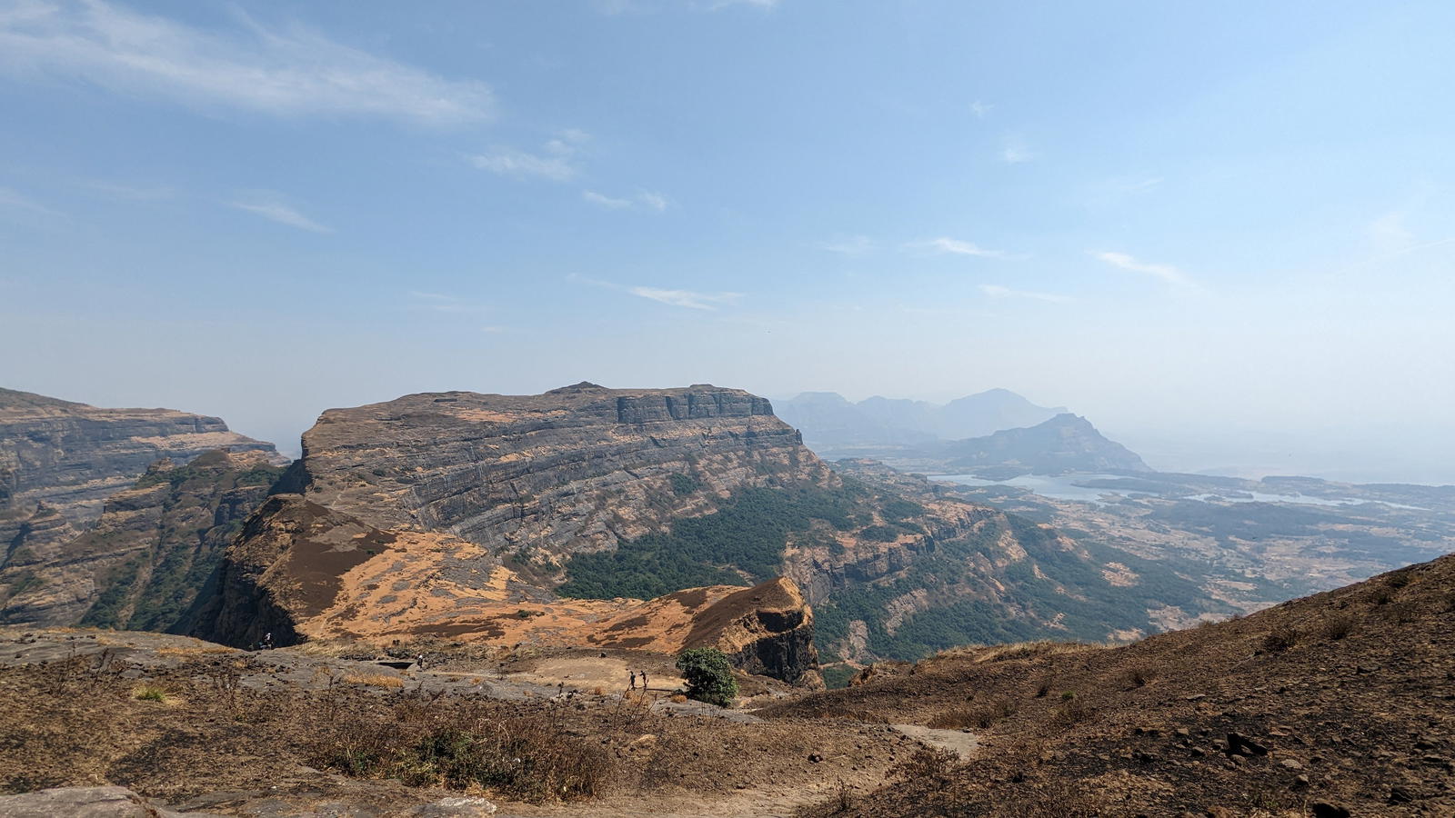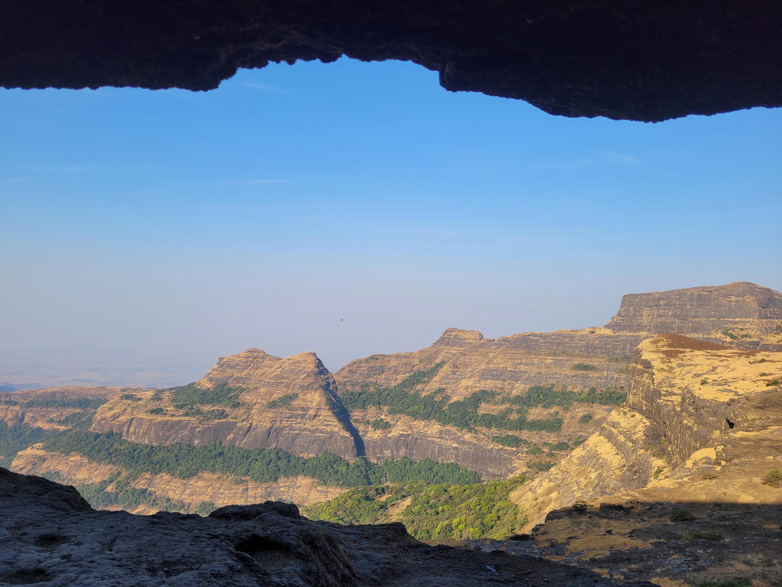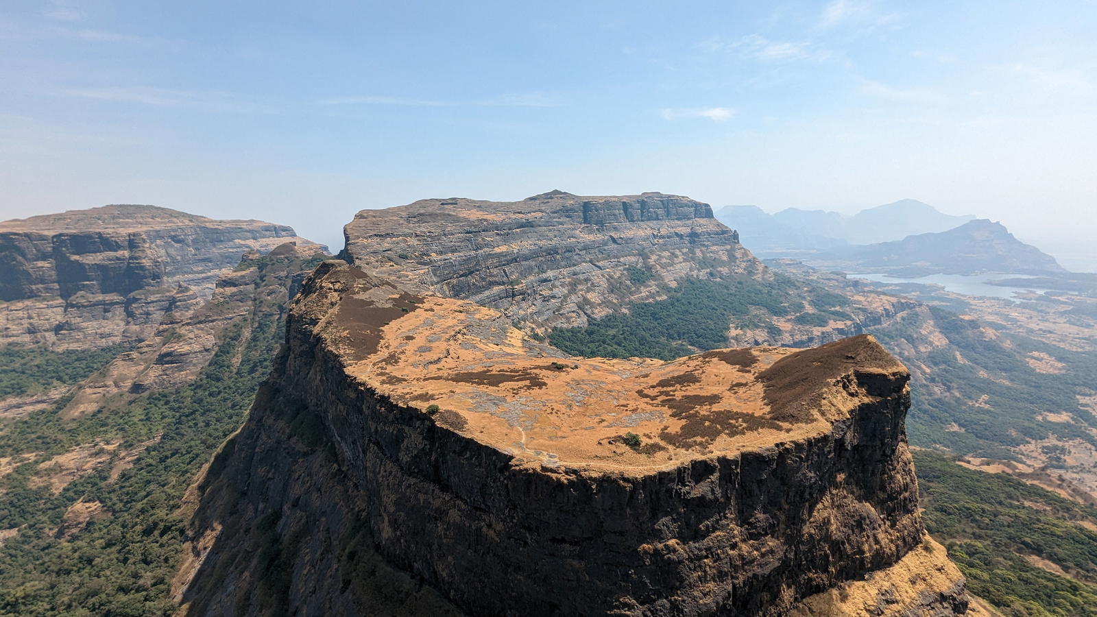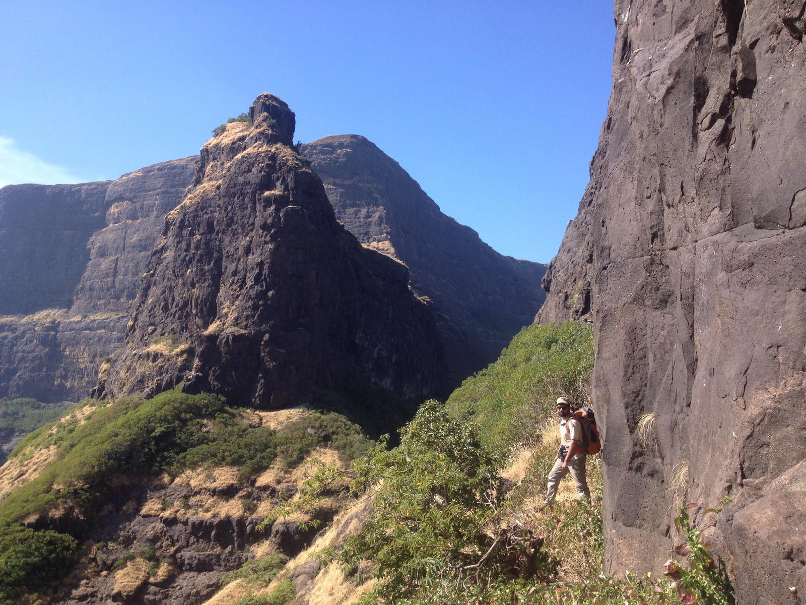 The climb preferred is usually between Madan and Alang. The time taken could around 3-4 hours to reach the step after leaving Kulung fort. Over here rock climbing would be required as the wall of the steps was destroyed during the cannon fire. Use of a fixed rope is required. There is one large cave on this fort and 2 water cistern. The top of the fort is a huge plateau. On the fort, there are two caves, a small temple and 11 water cisterns. Remnants of buildings are spread over the fort. Kalasubai, Aundh Fort, Patta and Bitangad are to the east of the fort, Harihar, Trimbakgad and Anjaneri to its north and Harishchandragad, Aajobagad, Khutta (pinnacle), Ratangad and Katrabai to its south.