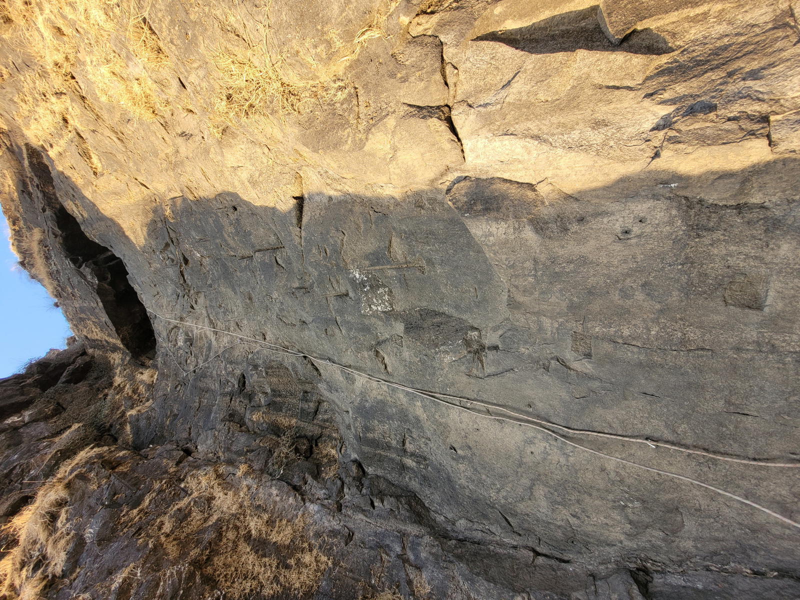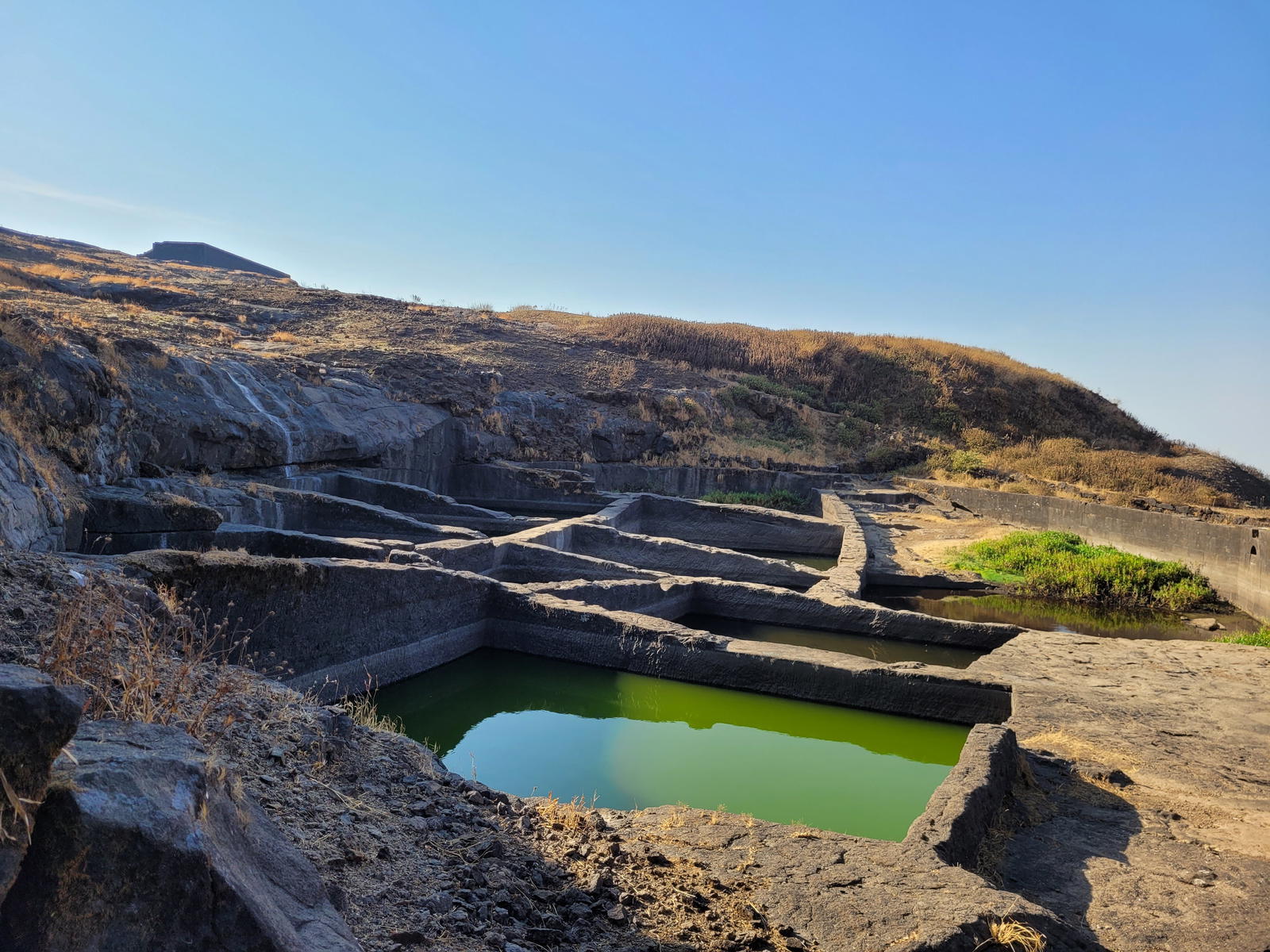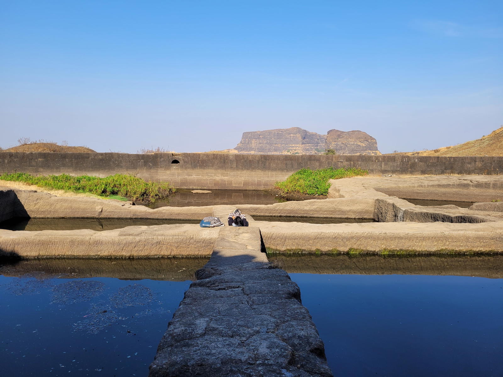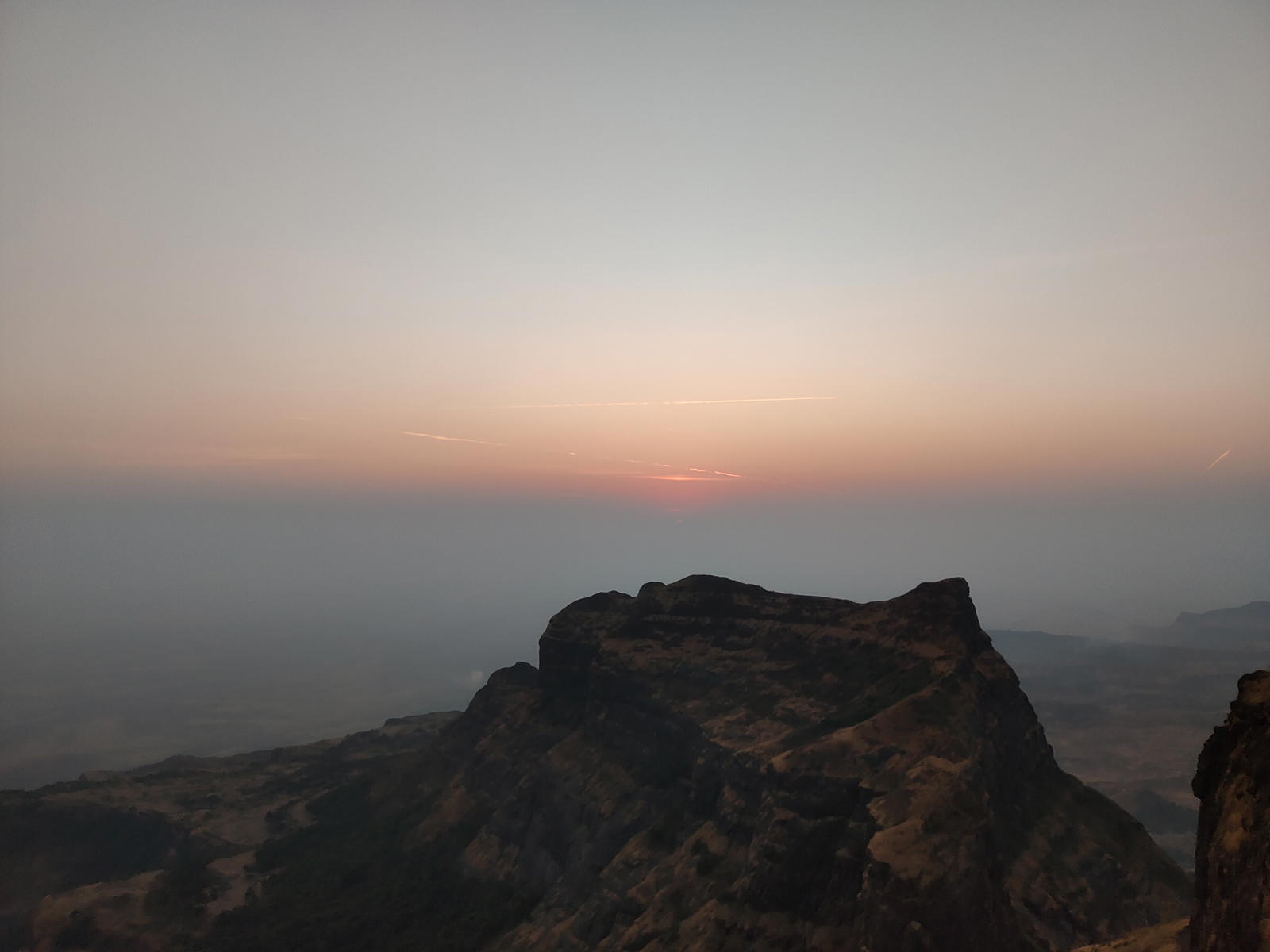The climb preferred is usually between Madan and Alang. The time taken could around 3-4 hours to reach the step after leaving Kulung fort. Over here rock climbing would be required as the wall of the steps was destroyed during the cannon fire. Use of a fixed rope is required. There is one large cave on this fort and 2 water cistern. The top of the fort is a huge plateau. On the fort, there are two caves, a small temple and 11 water cisterns. Remnants of buildings are spread over the fort. Kalasubai, Aundh Fort, Patta and Bitangad are to the east of the fort, Harihar, Trimbakgad and Anjaneri to its north and Harishchandragad, Aajobagad, Khutta (pinnacle), Ratangad and Katrabai to its south.